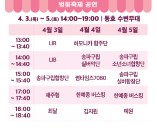 - 4/3~4/5 벚꽃공연: 매일 오후 2시~7시, 합창단과 인디 뮤지션 공연, 버스킹