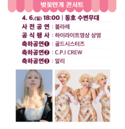 - 4/6 벚꽃만개 콘서트: 알리, 골드시스터즈 등 인기 아티스트의 무대
