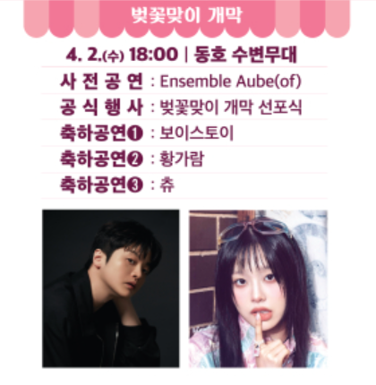 - 4/2 개막식: 동호 수변무대에서 열리는 개막 선포식과 함께 보이스토이, 황가람, 츄의 축하공연